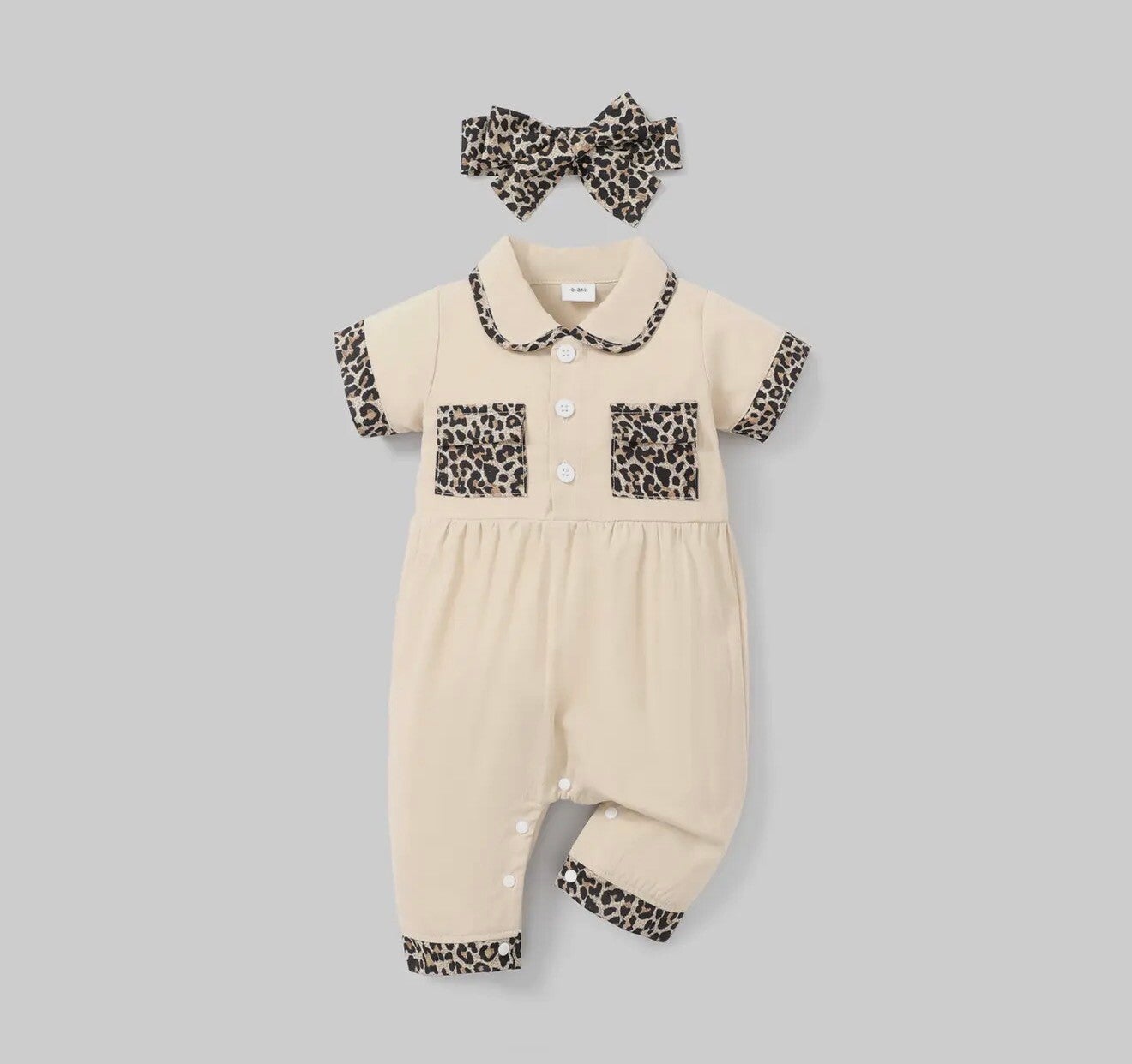 This adorable baby romper set combines style and comfort. The beige romper features a classic collared neckline with leopard print trim, two front chest pockets, and button detailing for a chic touch. Leopard print accents on the sleeves, collar, pockets, and cuffs add a trendy flair. The romper has snap buttons at the bottom for easy diaper changes. Completing the outfit is a matching leopard print bow headband, making it perfect for casual outings, photoshoots, or special occasions. Suitable for baby boys or girls, this outfit blends playful design with everyday practicality.