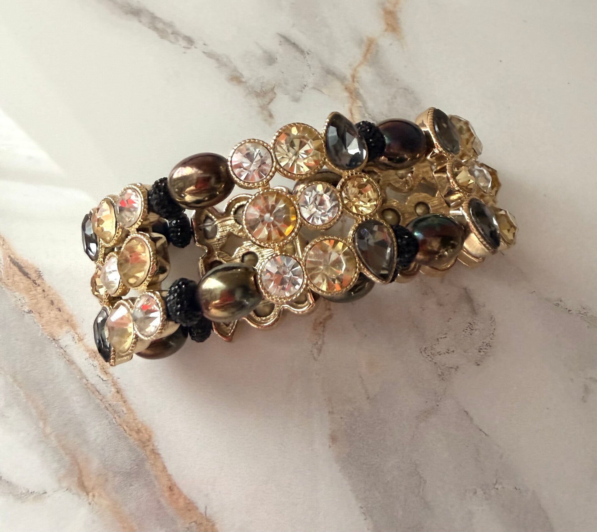 Dazzle from day to night with the Golden Radiance Crystal Bracelet, a handcrafted statement piece that exudes pure luxury. Featuring lustrous gold-toned metalwork, sparkling faceted crystals, and deep iridescent beads, this bracelet captures the warm glow of sunset light with every movement.