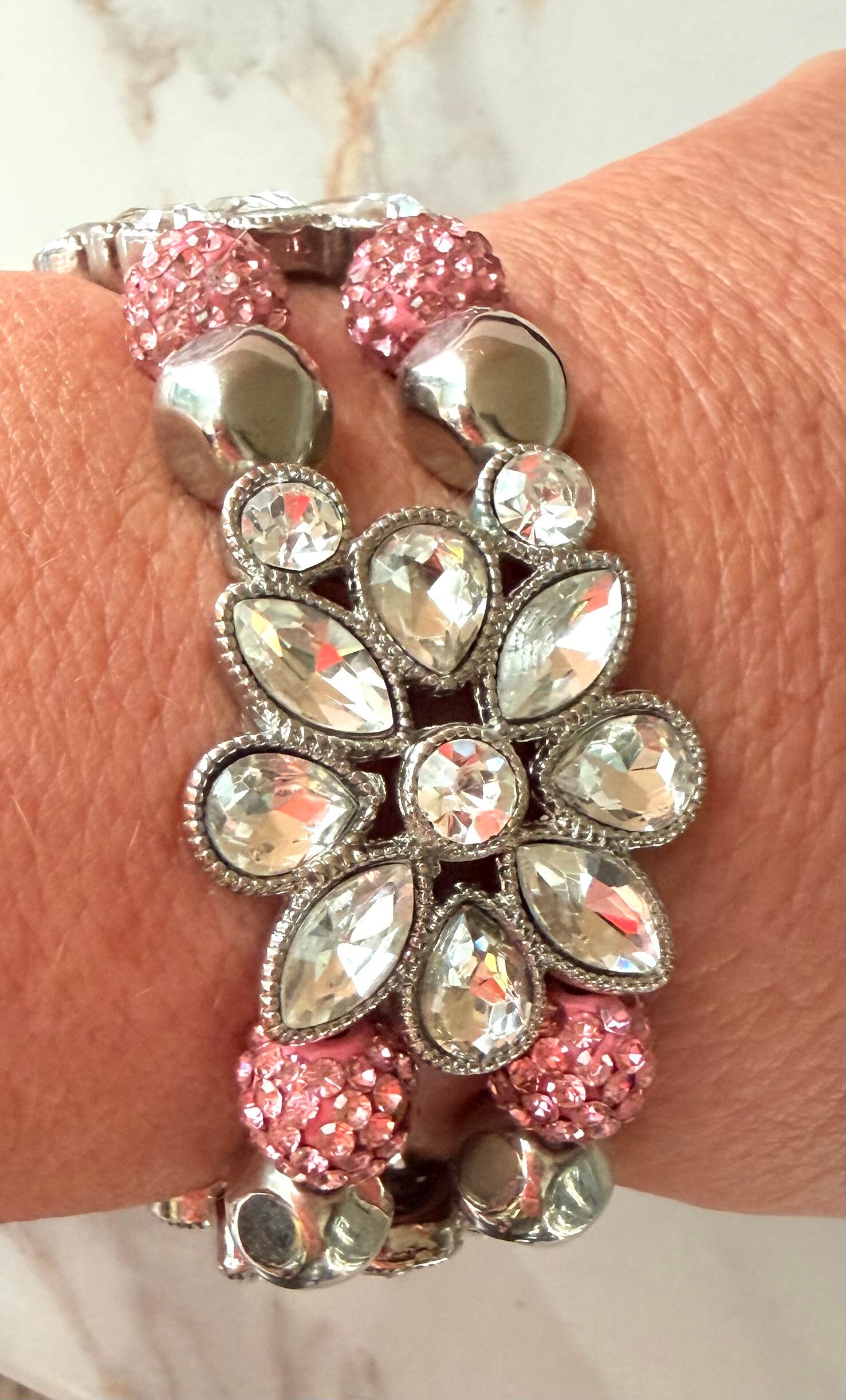 This stunning stretch bracelet features two radiant floral clusters made of crystal-clear gemstones framed in elegant silver. Soft pink rhinestone beads add a touch of warmth and sparkle, beautifully balancing the metallic shine. Designed for comfort and flexibility, this bracelet blends vintage-inspired floral charm with modern glamour — a perfect statement piece for any occasion.