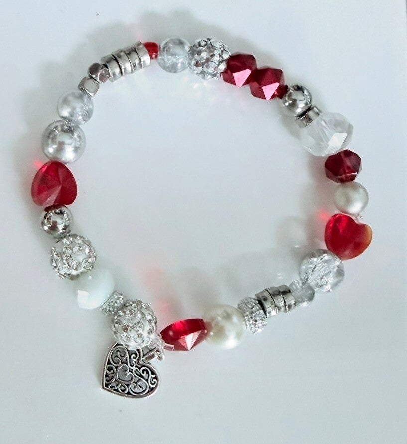 This elegant handmade bracelet combines rich red crystal hearts, luminous pearls, and sparkling rhinestone beads for a timeless romantic look. The silver heart charm adds a meaningful finishing touch, making this bracelet a lovely symbol of love, friendship, or self-love. Designed with a stretch fit for effortless wear.