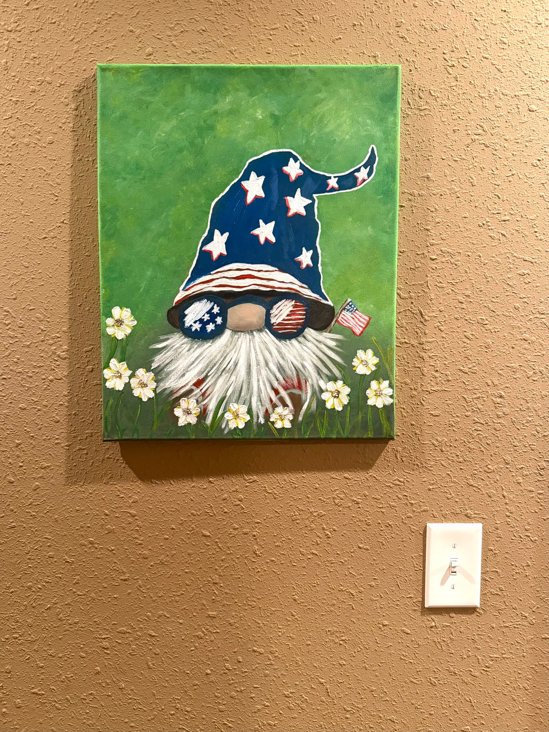 This 16x20 oil painting features a playful gnome adorned in patriotic flair, wearing a deep blue hat sprinkled with stars and striped accents reminiscent of the American flag. His oversized sunglasses reflect red, white, and blue pride, while a small flag waves cheerfully at his side. Set against a textured green background, the gnome is surrounded by soft white flowers that add a gentle, whimsical contrast to the bold colors. The piece blends folk-art charm with festive Americana, creating a lighthearted and joyful celebration of summer, freedom, and fun.