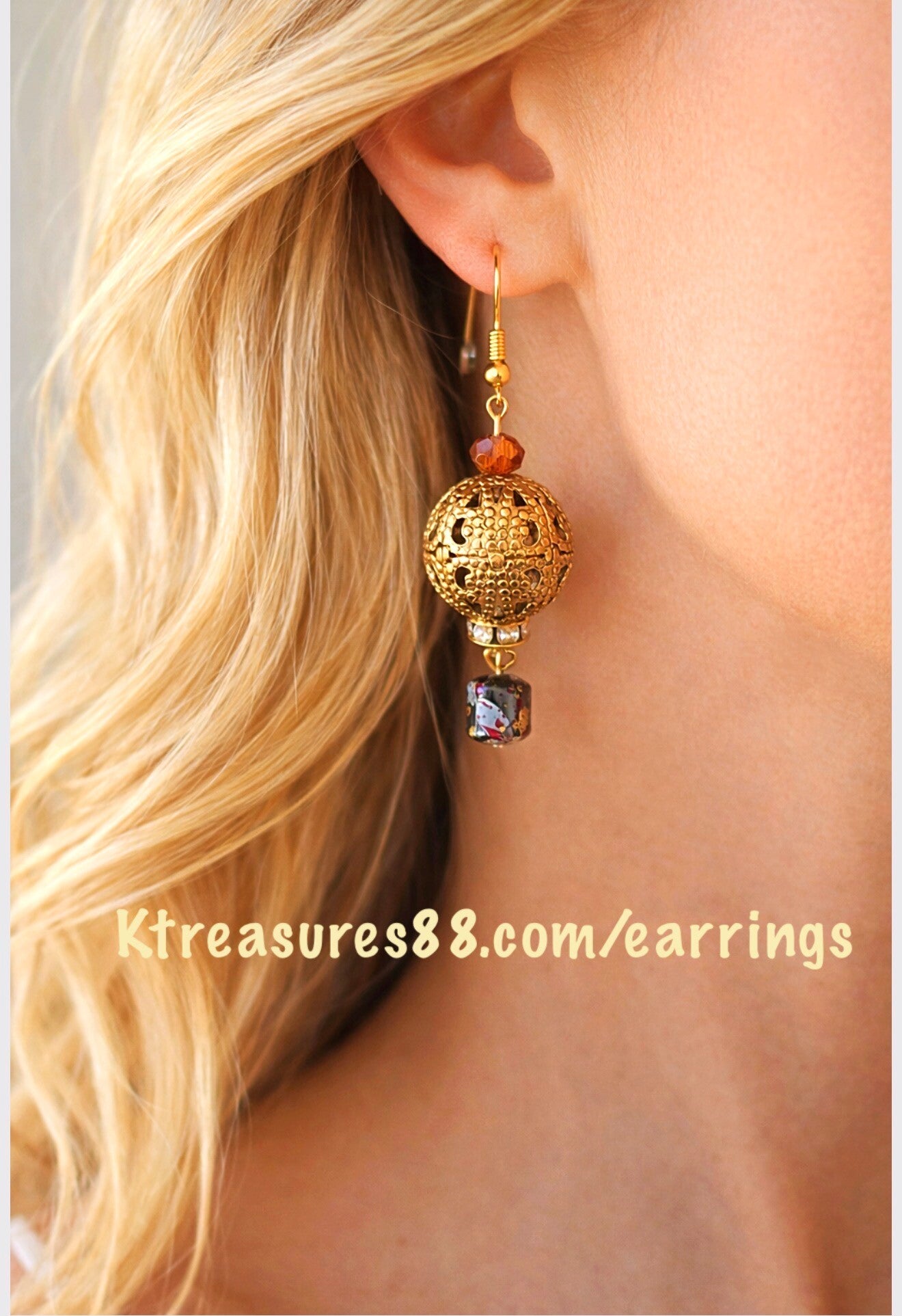 Make a statement with these gold filigree drop earrings, handcrafted locally for a timeless yet distinctive look. Featuring an intricate gold filigree sphere, warm crystal accents, and a unique patterned glass drop, these earrings catch the light beautifully with every movement.